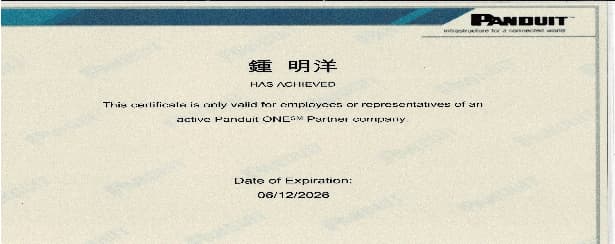 為強化對國際品牌產品的專業認知,我司積極參與 Panduit 官方訓練課程,深入了解光纖與銅纜結構化佈線標準、產品應用與系統整合邏輯,提升專案規劃與銷售專業度。